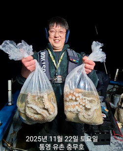 11월 22일(토) 오후문어 #철수조황토요일 선상 오후(야간)문어 철수조황입니다.2.735K!! 요즘 최대 무게가 계속해서 갱신되고 있습니다.심신 안정을 위해 마리수는 잠시 내려놓으시고,이벤트나 개인 기록어에 도전해보시면 좋을 듯합니다.오늘도 다들 고생 많으셨습니다.월요일 전투낚시 1자리 취소로 여유 있습니다.#예약문의(사무실)010-9334-0746 11월 30일까지는 문어 출조!12월부터는 감성돔 또는 문어 중 먼저 예약된 어종으로 출조가 진행됩니다.사용하지 못한 무료승선권이 남아 있다면 서둘러 사용하실 것을 권장드립니다.예약현황은 수시로 업데이트 되니 아래 링크에서 확인하세요.[예약현황]https://band.us/band/62820210/post/6226 *더 많은 영상과 이벤트, 새로운 소식이 궁금하시면 충무호 밴드로 놀러오셔요!!!!![통영 유촌 충무호] https://band.us/@cm6888 *** 통영 충무호 예약 안내 ***예약문의 : 010-9334-0746오시는길 : 경남 통영시 도산면 저산유촌길 105홈페이지 : https://chungmu.sunsang24.com/
